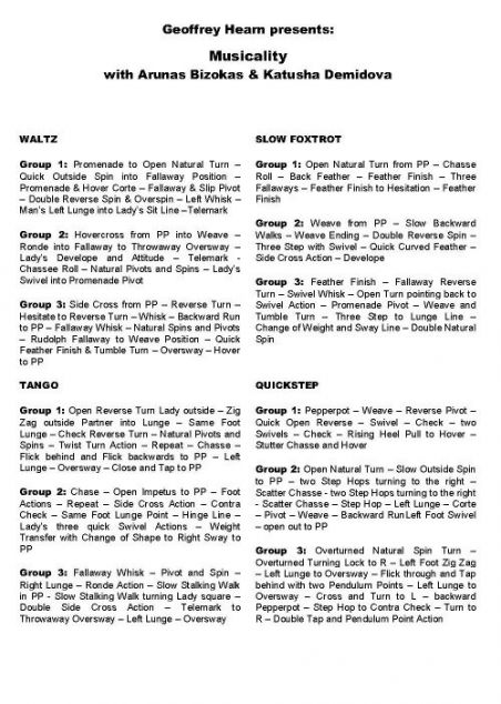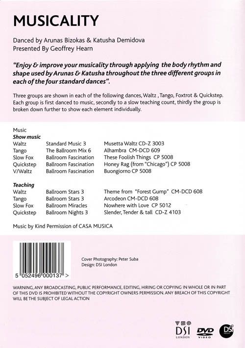 The multiple professional world champions Arunas & Katusha show how you can improve your musicality by using the body rhythm and shapes of Arunas & Katusha, which they perform in three different groups in Waltz, Tango, Slowfox and Quickstep. See illustration for details.