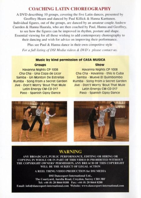 This Production describing 10 groups, covering the five Latin Dances, presented by Geoffrey Hearn and danced by Paul Killick & Hanna Karttunen. Individual figures, out of the groups, are danced by an amateur Couple Andrew Cuerden & Hanna Haarala, who are then coached by Paul, Hanna and Geoffrey, to see how the figures can be improved in rhythm, posture and shape. Essential viewing for all those wishing to add contemporary choreography to their dancing and wish for advice on improving their performance.