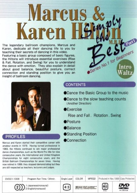 The legendary ballroom champions Marcus and Karen dedicate all their dancing life to you by teaching their secrets of dancing In this video. Featuring a basic group composed of basic figures, the Hiltons will Introduce essential exercises (Rise & Fall, Rotation. and Swing) for you to understand the dance with emotion. They also explain in detail about good balance, beautiful posture, correct connection and standing position to give you an Insight of ballroom dancing.